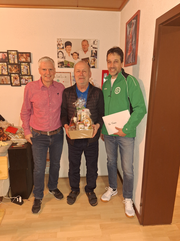 Georg Schuhmacher und Jürgen Körner besuchten den Jubilar zu seinem Ehrentag und überreichten nach der herzlichen Gratulation einen Präsentkorb und einen Geldbetrag der Jugendabteilung des FC Rot.