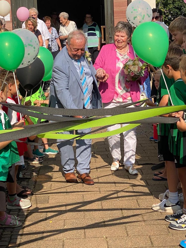 Seit 50 Jahren ist Franz Owesny für die Jugendabteilung tätig, so kamen viele Kinder, Jugendliche, Trainer und Betreuer vom FC, um vor der Kirche Spalier zu stehen. Als Überraschung musste sich das Paar den gemeinsamen Weg freischneiden. Eine Schere half den Weg durch die gespannten Bänder zu bewältigen, die den Lebensweg als symbolträchtiges „auch das schaffen wir gemeinsam“ darstellte. Am Ende wurde ein Geschenk und ein Blumengruß überreicht.