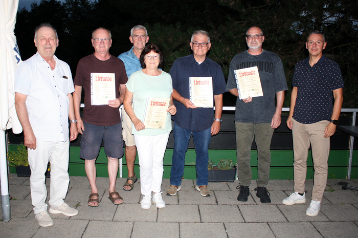 Verwaltungsvorstand Franz Götzmann, Klaus Grün, Finanzvorstand Hermann Lang, Luise Götzmann, Günter Gottselig, Christian Heinzmann und Sportvorstand Achim Jung